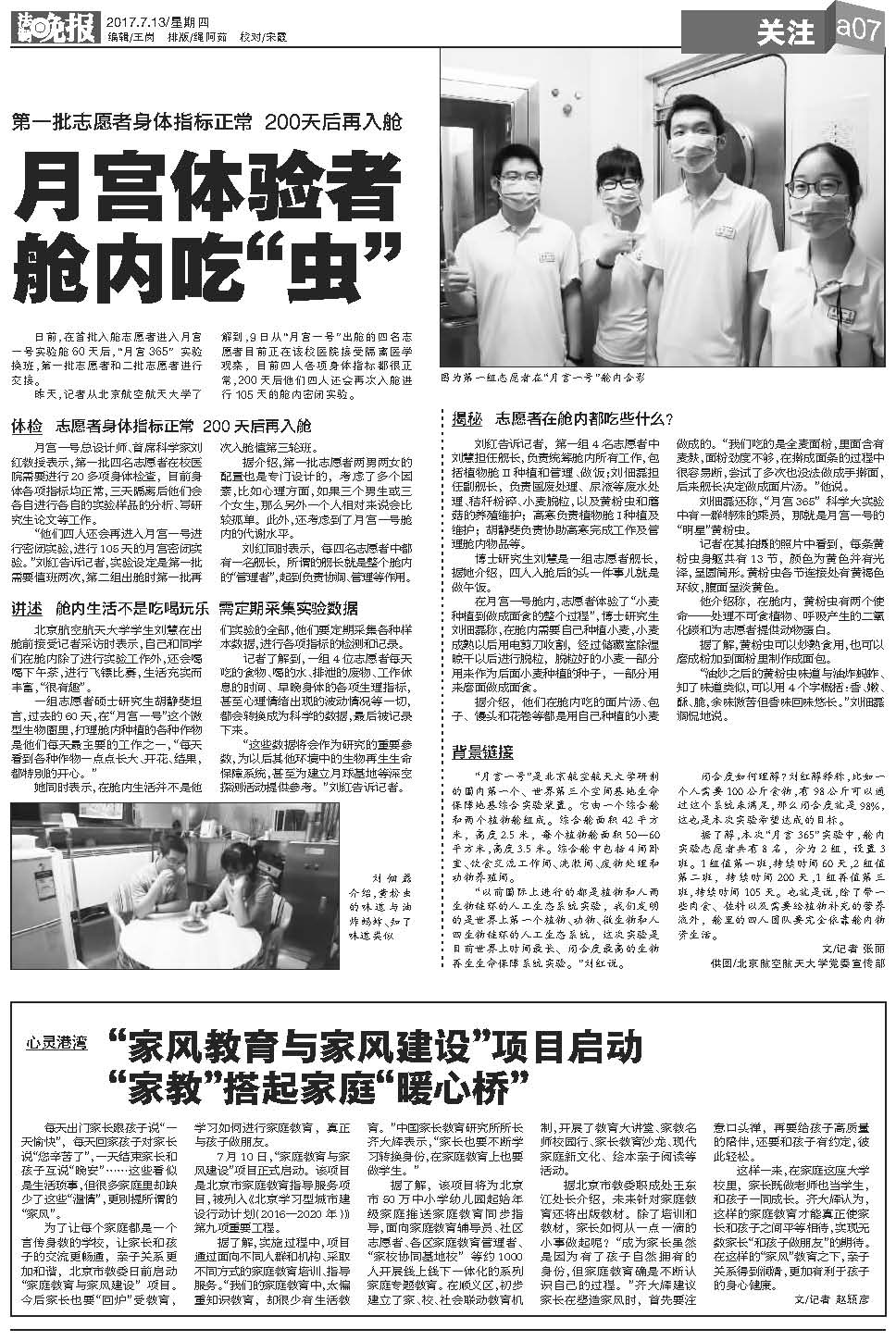 《法制晚报》2017年7月13日(记者张丽)报道我校“月宫365”实验: