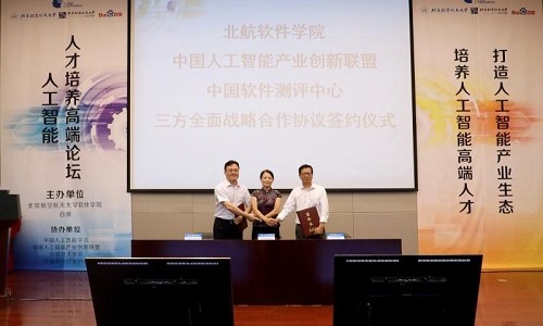 北航软件学院、中国人工智能产业创新联盟、中国软件测评中心共同签署了全面战略合作协议,标志着人工智能高端人才的联合培养正式拉开序幕。