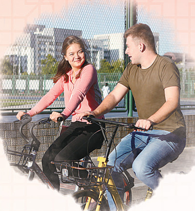 法国人张浩成(右)和哈萨克斯坦人奇娜拉在校园里骑共享单车