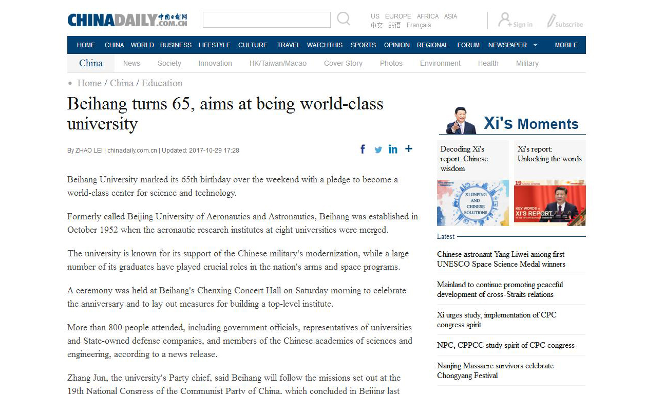Zhang Jun, the university's Party chief, said Beihang will follow the missions set out at the 19th National Congress of the Communist Party of China, which concluded in Beijing last week, and will strive to become a prestigious institute and build its research wings into world leaders in their fields.