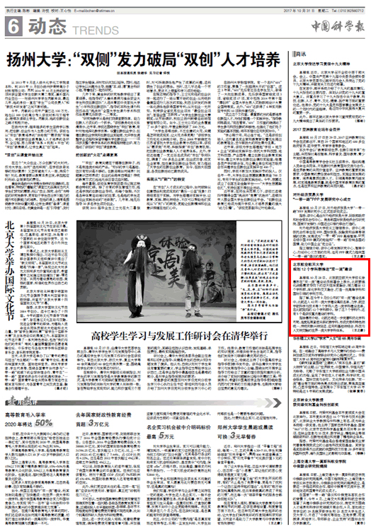 《中国科学报》2017年10月31日第6版报道我校学习贯彻十九大精神,加快推进“双一流”建设动员部署会: