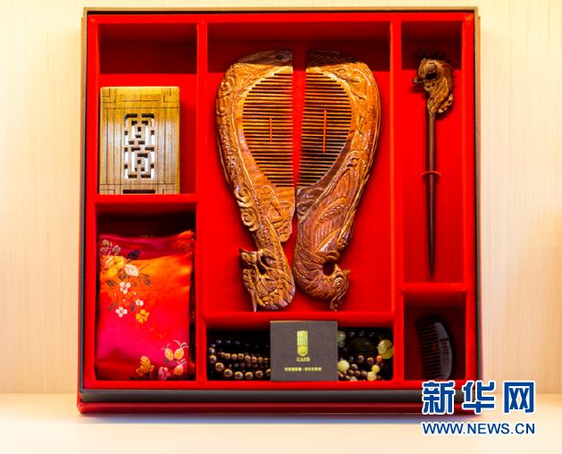 山西心言工艺品有限公司生产的“龙凤对梳”。该公司负责人雷永祥称,中阳县负责了公司赴太原参加第三届山西省文博会的展台和住宿等费用。新华网 发(马梦迪 摄)