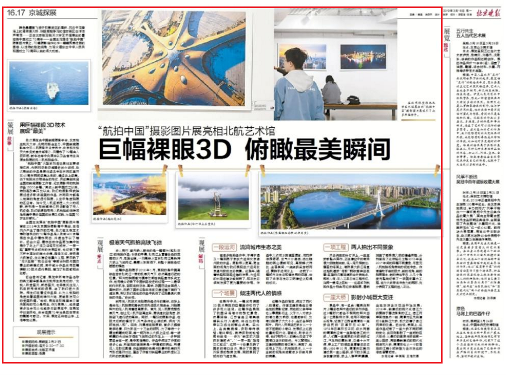 全国主流媒体“航拍中国”摄影图片展曾在2018年北京国际摄影周中展出,在海内外产生了强烈的反响,此次在北航艺术博物馆展出的70幅作品是从此前400余幅展出作品中精选而出,并适当予以了增补。杨谷介绍,精选出的作品更加集中地展示了北上广深及沿??懦鞘小ⅰ耙淮宦贰敝匾诘愠鞘械姆⒄咕薇?,也记录了事关民生福祉的南水北调、西电东送、港珠澳大桥建设、生态建设等重大工程,更反映了“观天巨眼”“航母出?!钡惹把乜萍加牍朗乱档幕曰统删?,其中部分作品采用巨幅裸眼3D技术进行展现,增加了科技感和体验感。