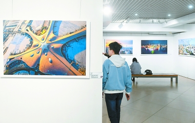 在北京航空航天大学艺术馆展出的“航拍中国”摄影图片展吸引了众多年轻学子。