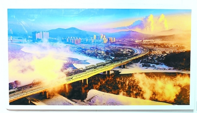 步入展厅,首先映入眼帘的是一幅题为《越松花江》的航拍作品:冬日的早晨,松花江上冒着白色的蒸腾的水汽,宛若仙境,一列高铁从吉林松花江高铁特大桥上飞驰而过,晨曦从东面洒下,将整个画卷染成暖暖的橘色……