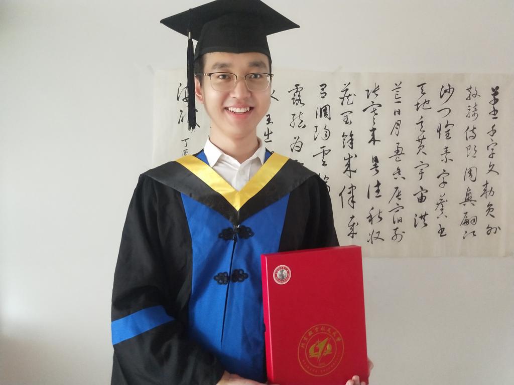 北航电子信息工程学院本科生马子墨在家中穿起学位服(图片由北京航空航天大学提供)