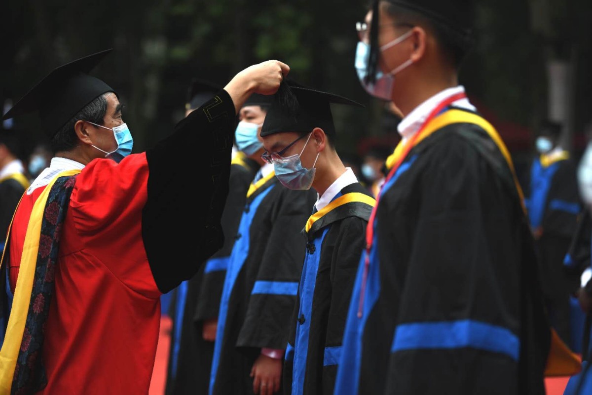 今天的典礼上,拨穗方式也相当特别,校园里,北航老师走到学生中间,为他们拨动流苏,而未能返校的学生则邀请家长拨穗正冠,实时回传的画面,让大家在屏幕上同框。
