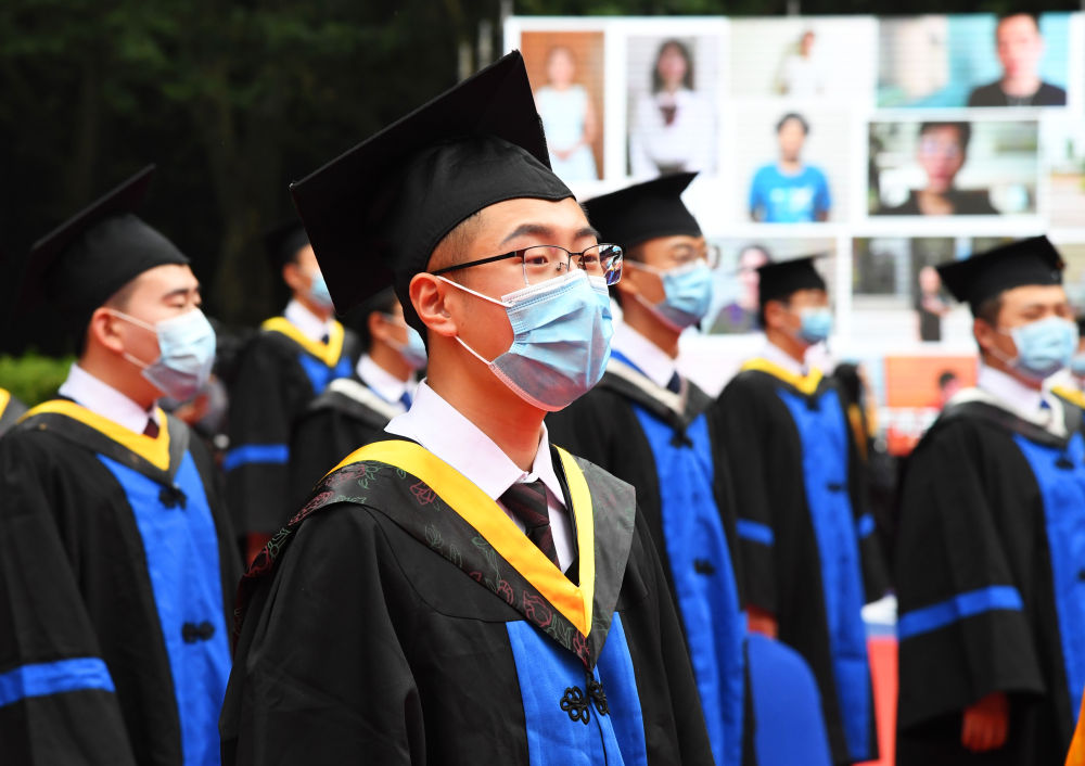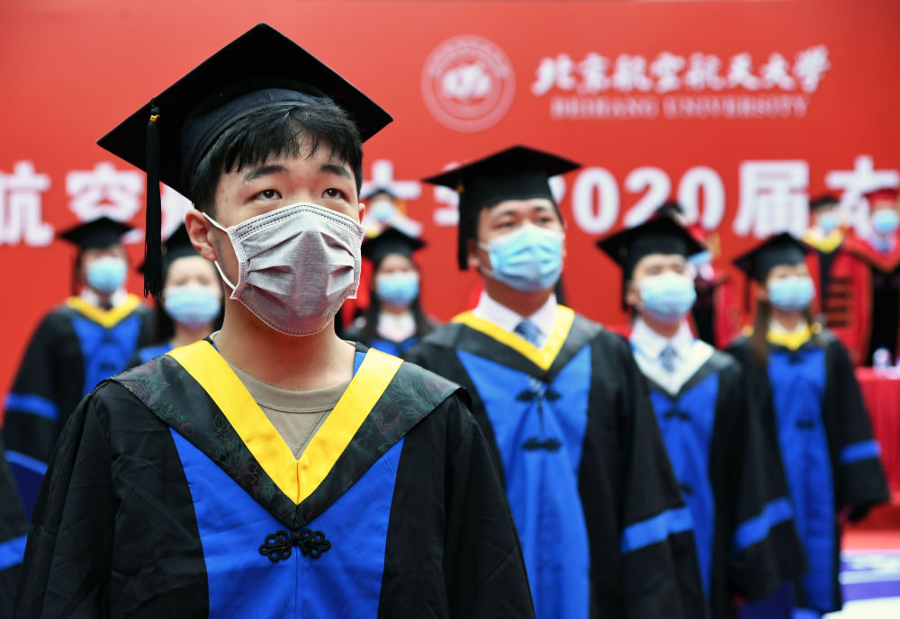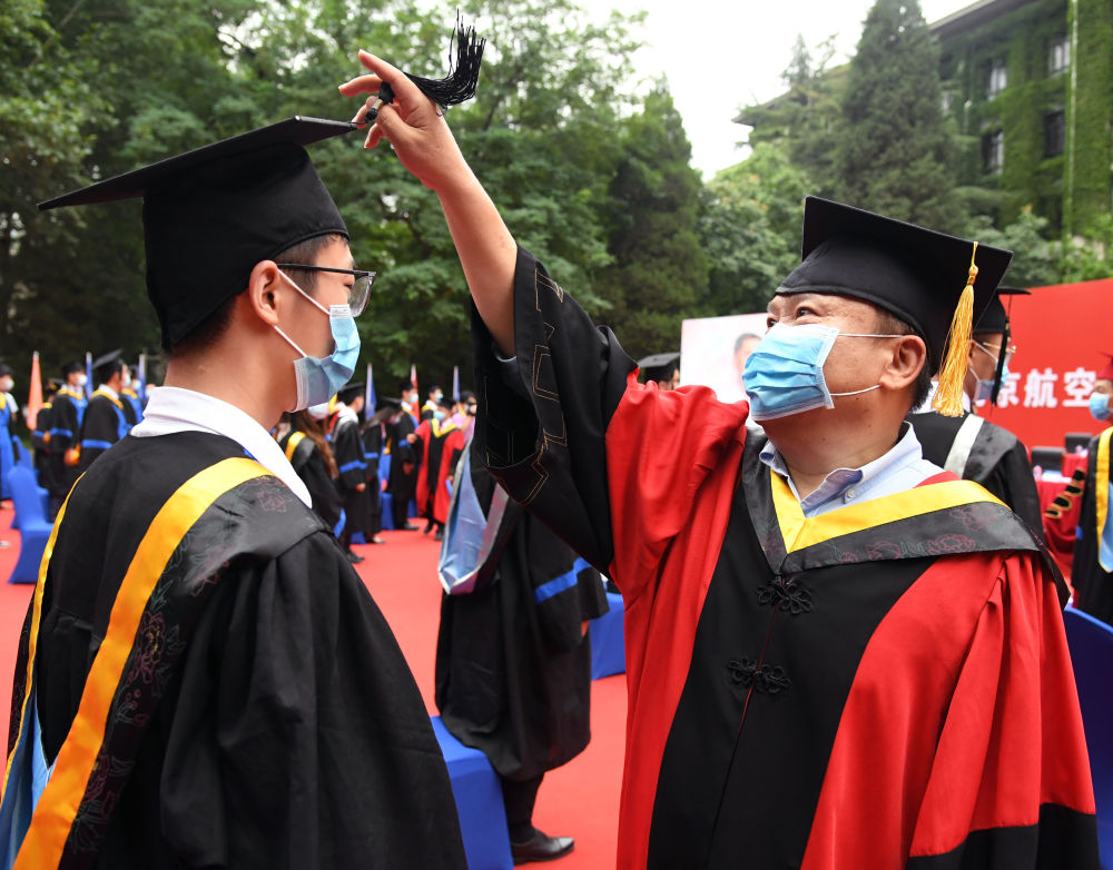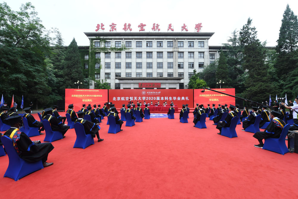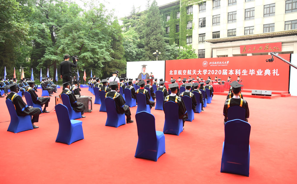当日,北京航空航天大学举行2020届本科生毕业典礼。由于疫情防控需要,今年的典礼在北京航空航天大学主楼广场举行,仅少量在校本科毕业生现场参加,更多本科毕业生通过线上直播参与毕业典礼。(新华社记者 任超 摄)