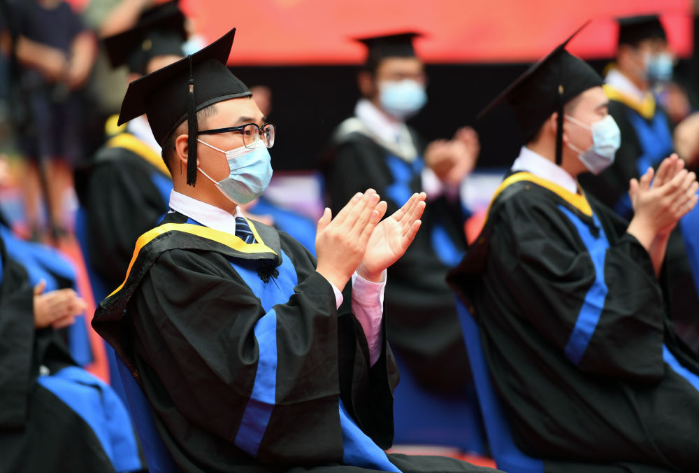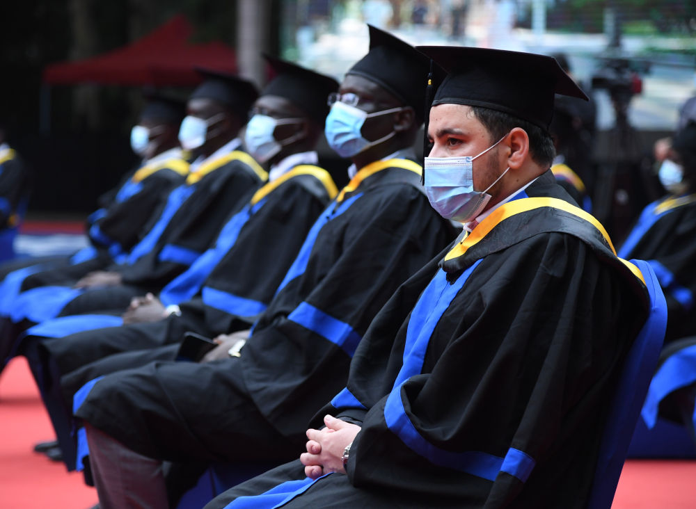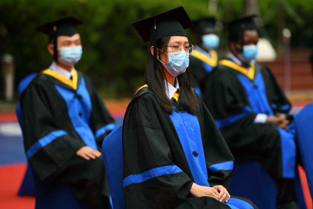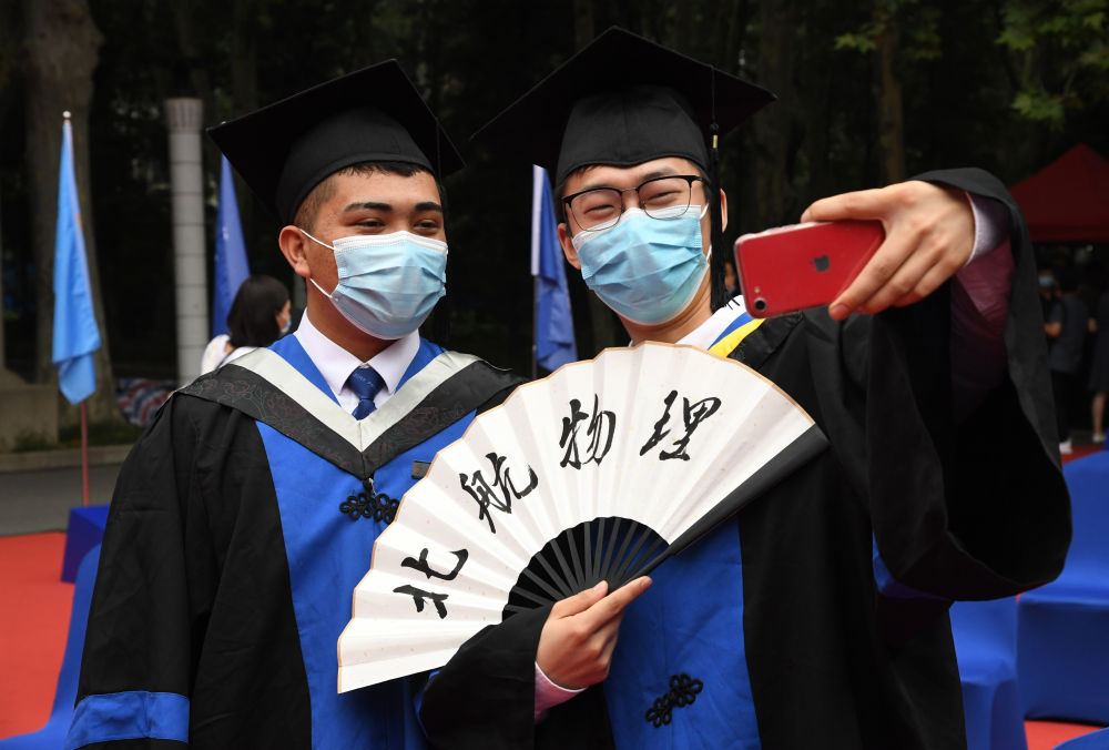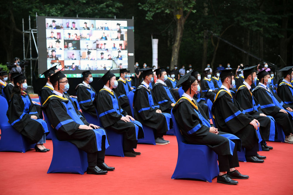 当日,北京航空航天大学举行2020届本科生毕业典礼。由于疫情防控需要,今年的典礼在北京航空航天大学主楼广场举行,仅少量在校本科毕业生现场参加,更多本科毕业生通过线上直播参与毕业典礼。(新华社记者 任超 摄)