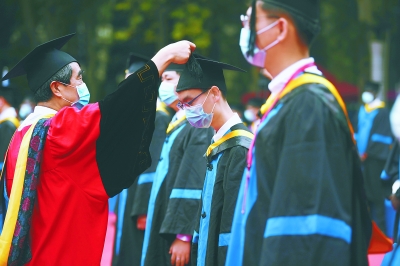 今天的典礼上,拨穗方式也相当特别,校园里,北航老师走到学生中间,为他们拨动流苏,而未能返校的学生则邀请家长拨穗正冠,实时回传的画面,让大家在屏幕上同框。(记者任敏)