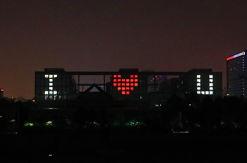 作为北航最有历史感的建筑,快要70岁的老主楼上妆点一颗巨大的红心,简洁、有力地诠释“爱祖国、爱航空、爱航天、爱北航”。