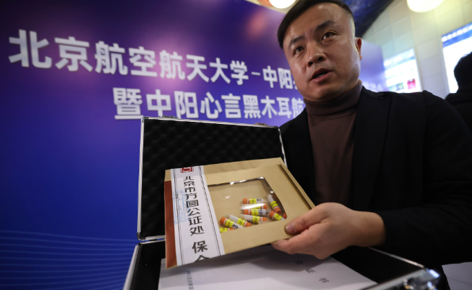 12月18日上午,在北京航空航天大学“月宫一号”实验室,一份曾在太空遨游两周的黑木耳菌株“回家”,被正式交接给山西省吕梁市中阳县的“心言豹林山耳(木耳名称)”有机黑木耳种植基地。