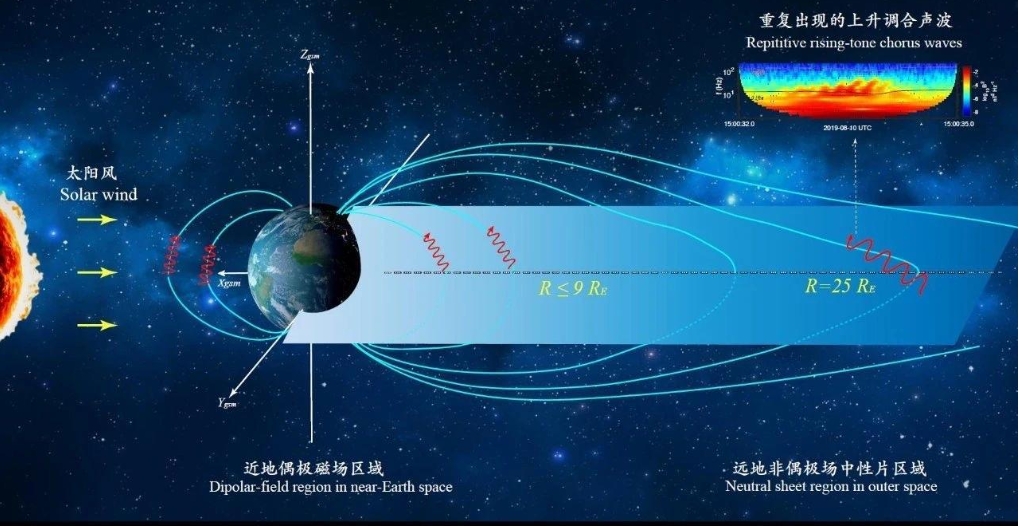 北航曹晋滨院士团队长期从事地球空间等离子体电磁波动和波粒相互作用研究,取得了多项重要成果。刘成明副教授等人在对合声波非线性理论进行深入研究后,认为合声波的产生是一个基本空间等离子体物理过程,不仅在传统观点认为的近地空间偶极磁场区域存在,在非偶极磁场区域也应该存在。在对国际地球磁层多尺度卫星MMS海量数据分析后,他们首次在非偶极场结构的磁尾中性片区域发现了连续出现的合声波,证明了新观点。磁尾中性片区域磁场极为微弱,仅为地球表面磁场的万分之一的量级,其拓扑结构也与偶极场完全不同,在传统合声波理论框架下,那里不应该存在合声波。这一新发现打破了学术界关于合声波只能在地球偶极磁场控制的近地区域出现这一持续70多年的传统观点。