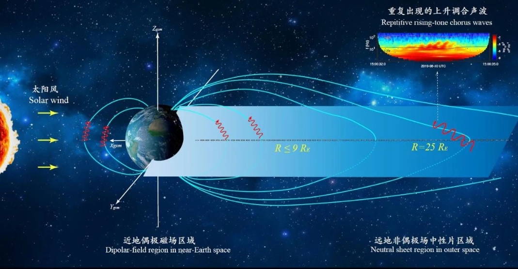 地球空间地磁场磁力线就像两端固定在地球南北磁极区的琴弦一样,当太阳风能量进入地球磁层空间,并通过相关物理过程“拨动”这些琴弦时,就会激发频率特征类似于清晨鸟鸣的电磁波,科学界称为合声波。