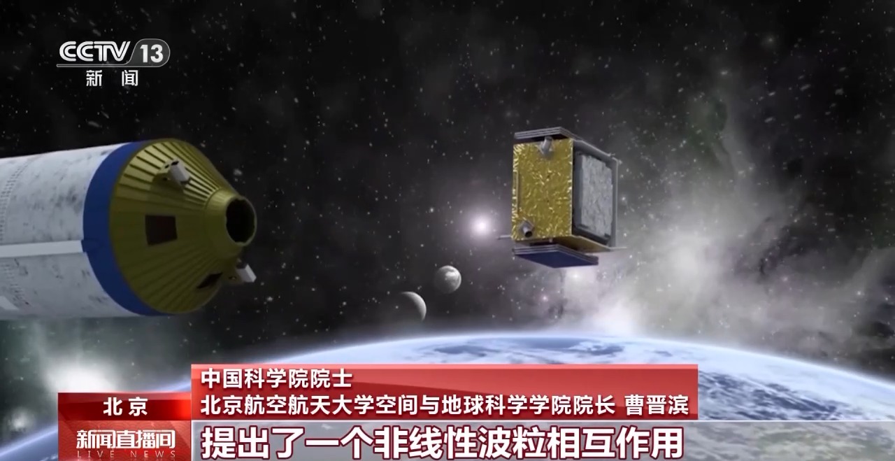 中国科学院院士 北京航空航天大学空间与地球科学学院院长 曹晋滨:我们利用卫星的观测数据,包括粒子的、电磁场的观测数据,提出了一个非线性波粒相互作用的物理过程,圆满地解释了在16万公里、距离地球比较遥远的非偶极磁场控制的区域,这个合声波的产生机制。