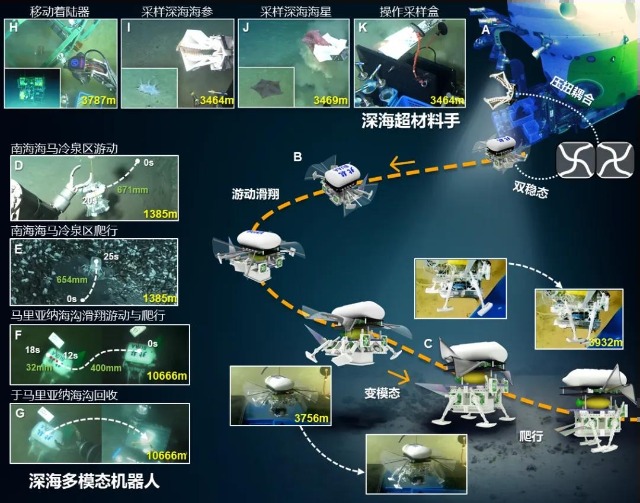 这一能在万米深海实现多模态运动的小型深??杀湫位魅耍杀本┖娇蘸教齑笱Вㄒ韵录虺啤氨焙健保┗倒こ碳白远г貉芯客哦恿现锌圃荷詈K?、浙江大学,历经6年共同研发而来,研究成果于3月20日发表在国际学术顶刊《科学·机器人》(Science Robotics),同时被Science Robotics官网首页大图介绍。