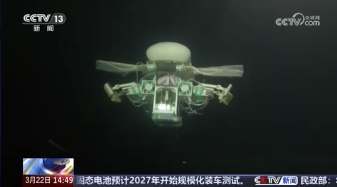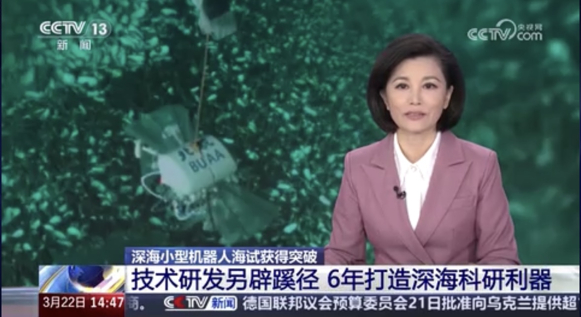 【同期】北航机械工程及自动化学院教授 文力:我们的机器人50厘米以内1.5公斤,它就非常的小,这样的机器人成本低,同时一次性呢,它可以由潜航器携带多个下去进行相关的科考或者是进行作业。