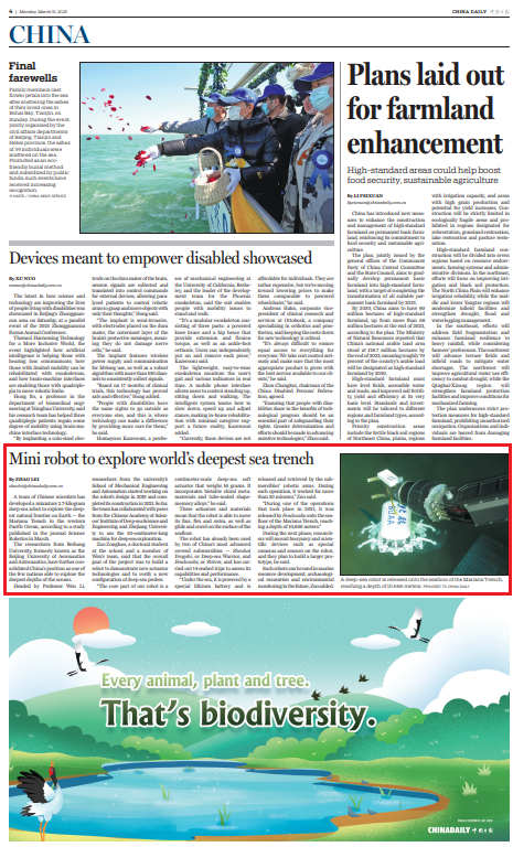 Zuo Zonghao, a doctoral student at the school and member of Wen's team, said that the overall goal of this project is to build a robot to demonstrate new actuator technologies and to verify a new configuration of deep-sea probes.