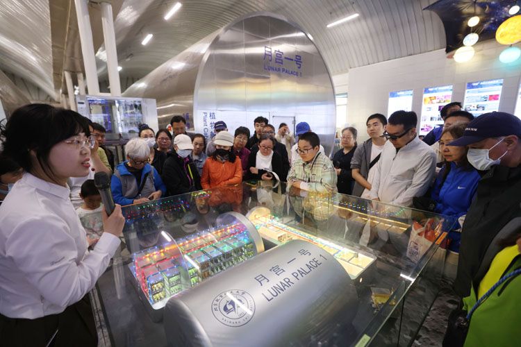 4月24日,“月宫一号”科普基地内,学生志愿者解答市民关于“月宫一号”的提问。