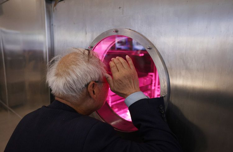一名老年参观者通过观察窗观看“月宫一号”内部?!霸鹿缓拧惫菇ㄆ鹑斯け蘸仙低常萌死嗌姹匦璧难跗?、水和食物在系统内实现循环再生,为太空驻留提供坚实保障。