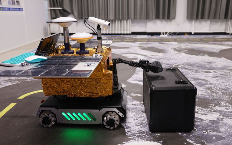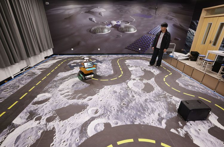 4月24日,北京航空航天大学,国内首个月球科研基地“数实混合泛在教学平台”中, 月球车按照系统规定任务在模拟月球环境中自动行驶。
