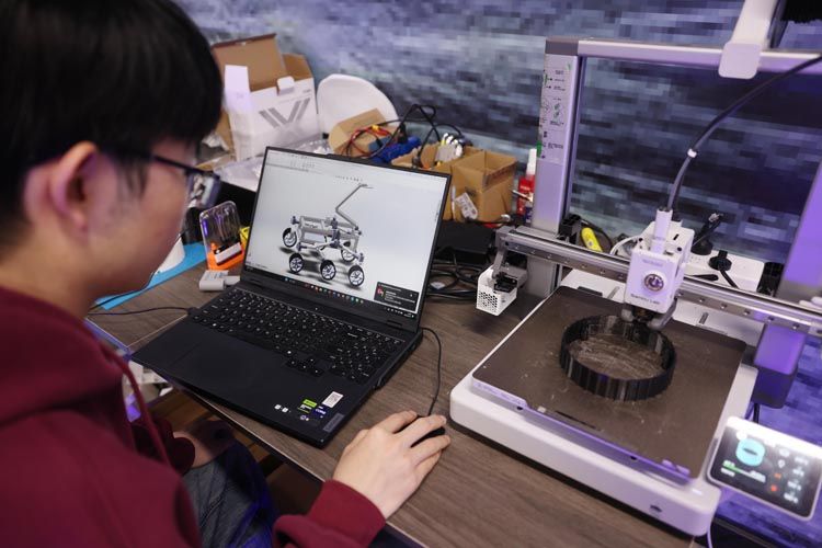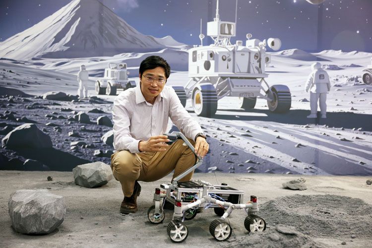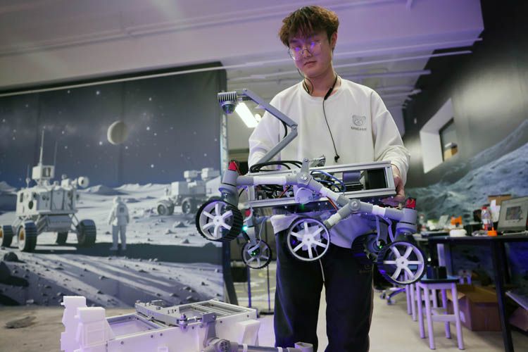 北航自动化科学与电气工程学院副教授崔勇调试月球车。他介绍,这是国内示范性的虚实融合泛在教学平台, ‘泛在’即广泛地存在,学生们可以随时在线上平台开展学习,完成虚拟实验。北航团队有机融合数字孪生、增强现实与智能交互技术,建成国内首个虚实融合的月球教学平台。