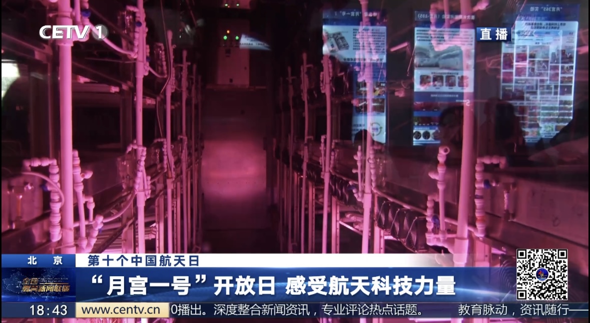 【解说】在第十个中国航天日到来之际,北京航空航天大学“月宫一号”科普基地举办公众开放日活动,通过现场讲解及模型展示,向公众介绍“月宫一号”作为生物再生生命保障系统的原理,展现了我国在航天生命保障领域的科技突破。
