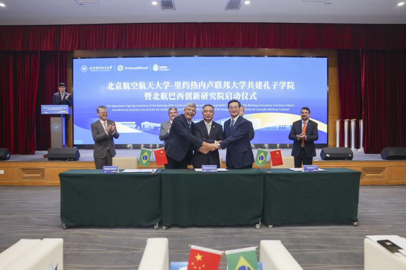 在中国和巴西教育部部门主管领导的见证下,北航校长王云鹏、里约热内卢联邦大学校长罗伯托·梅德罗尼奥、中国国际中文教育基金会副理事长兼秘书长赵灵山共同签署了孔子学院合作协议。根据协议,北航与里约热内卢联邦大学在巴西共建孔子学院,将发挥北航航空航天学科优势,推进“中文+航空航天”建设,联合开展汉语教学、文化交流、科研合作及人才培养。依托该孔子学院,北航在巴西建立北航巴西创新研究院,在北航杭州国际校园建设北航巴西中心,通过加强互访与交流,双方将共同推动教育、科技、文化等领域的创新发展。三个平台形成“文化筑基-科研破冰-产教融通”战略闭环,未来将以人文交流厚植民间友好,深化中巴科研联合攻关,培育新质生产力,全方位服务中巴命运共同体。