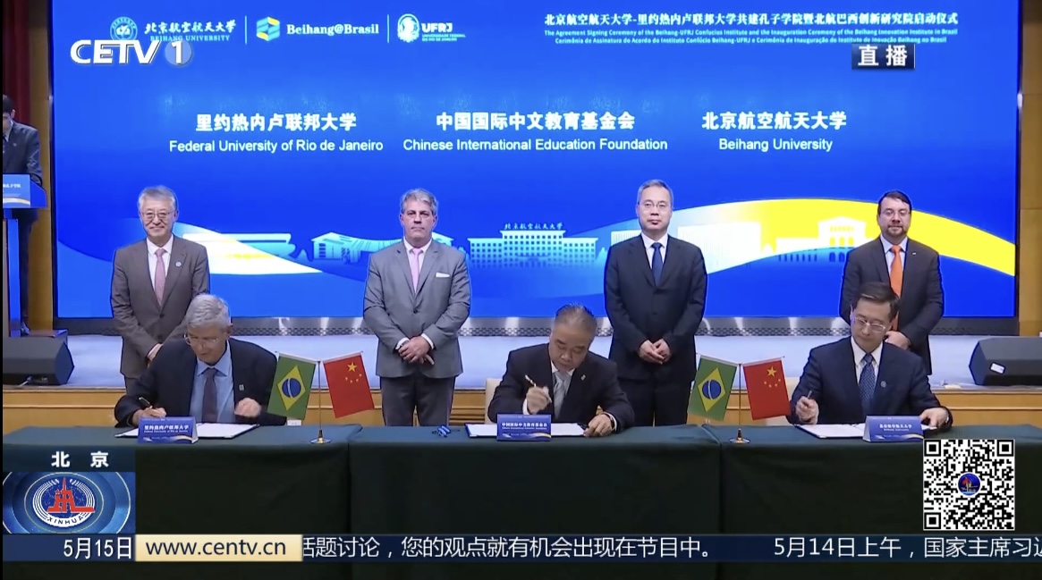 【解说】根据协议,北京航空航天大学与里约热内卢联邦大学在巴西共建孔子学院,将发挥北航航空航天学科优势,联合开展汉语教学、文化交流、科研合作及人才培养。依托该孔子学院,北航在巴西建立北航巴西创新研究院,在北航、杭州国际校园建设北航巴西中心,三个平台形成文化筑基、科研破冰、产教融通、战略闭环,深化中巴科研联合攻关,全方位服务中巴命运共同体。