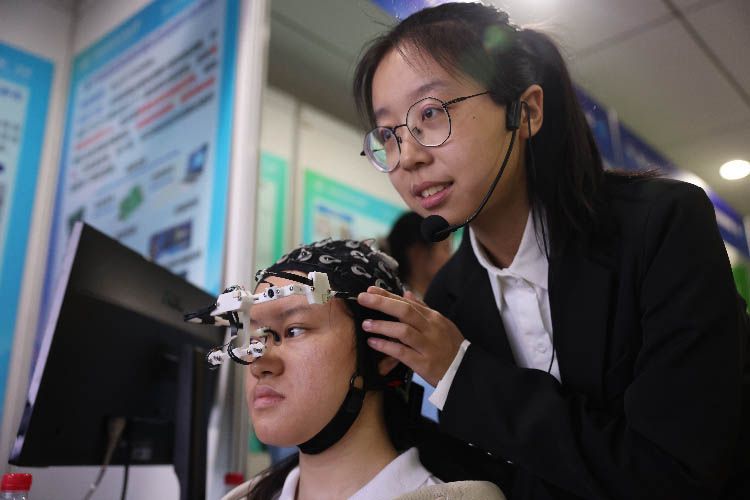 学生头戴脑电设备,体验一款基于双模态人机交互的康复系统。今年竞赛自3月启动以来,累计收到参赛作品近5000项,参与人次超过9000人,指导教师人数达到2600余人,覆盖本硕博所有年级。
