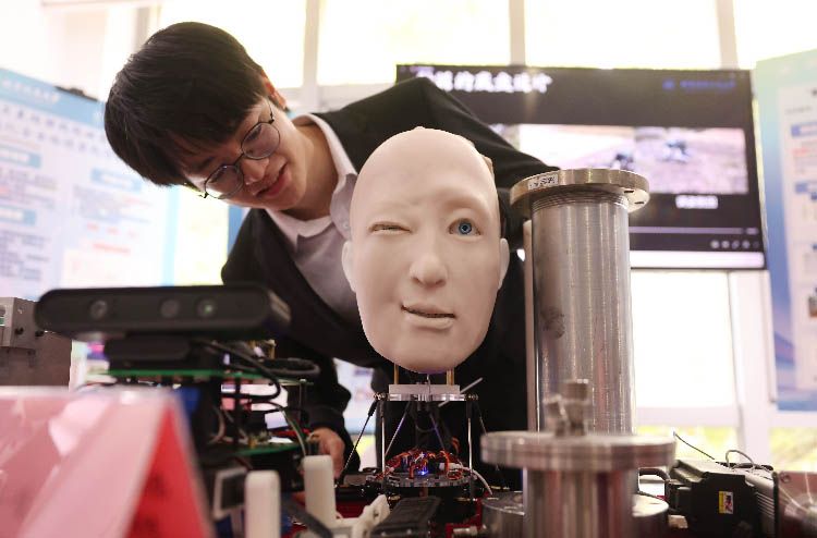 5月18日,北京航空航天大学第35届“冯如杯”竞赛展览展示在学院路校区举办。110个展位的400余项学生科技创新作品展出并邀请校外评委与学生评委共同打分。北航“冯如杯”竞赛始创于1990年,已连续举办35届,是北航学生参与度最高、影响力最大的科技创新赛事,学校所有参加中国国际大学生创新大赛、“挑战杯”等国家级高水平竞赛的项目均由“冯如杯”竞赛孵化而来。图为学生展示一款基于多模态情感交互的仿生机械人脸系统。