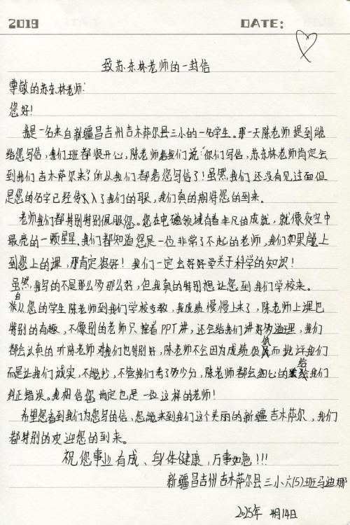 这场跨越数千公里的约定,始于吉木萨尔县第三小学支教老师陈奕霖的科普课堂。作为北京航空航天大学第26届研究生支教团成员,他在讲授电磁学基础时,给学生播放了他的导师苏东林在《开讲啦》的演讲视频,点燃了边疆少年对科学的热情。孩子们自发写下书信,稚嫩的笔迹里跳动着对科学事业的向往:“虽然我们未曾谋面,但您的事迹就像星星,一直在我的心中闪耀?!?/p>
