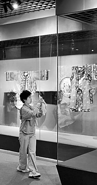 中央民族大学民族博物馆内,游客在参观展出的民族服饰。新华社发
