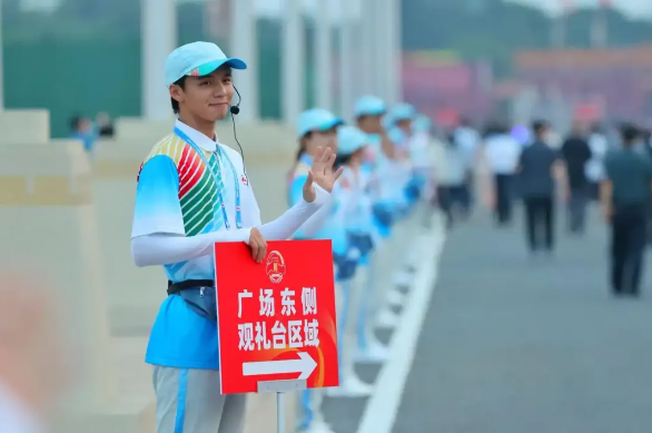 在中国人民抗日战争暨世界反法西斯战争胜利80周年纪念活动中,来自首都30多所高校的师生志愿者甘作“螺丝钉”,在纪念活动的重要点位,提供及时、周到的志愿服务,展现首都北京、当代中国的良好形象。