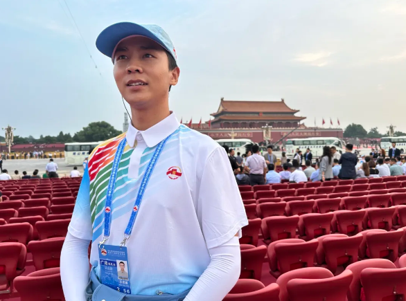 张明昊是北京工业大学建筑工程学院研二的学生。他既是学院的辅导员,又是本次活动的志愿者。作为学校观礼台志愿者组长,他需要记录关键流程、动作,每次演练出发前带着31名组员反复练习,保证服务质量。“双重身份意味着双份责任,希望能将此次活动作为重要的育人实践平台,和学生一起在志愿服务中锤炼品格、增长才干?!闭琶麝凰?。