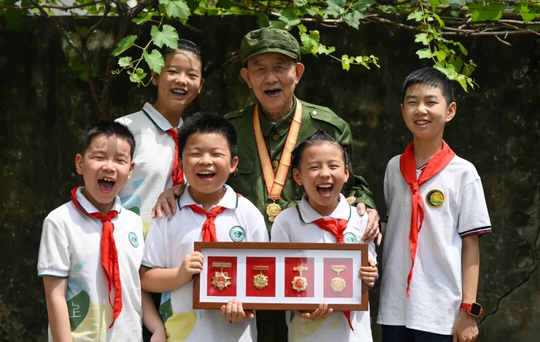 安徽省合肥市中小学生代表与抗战老兵合影。徐伟摄