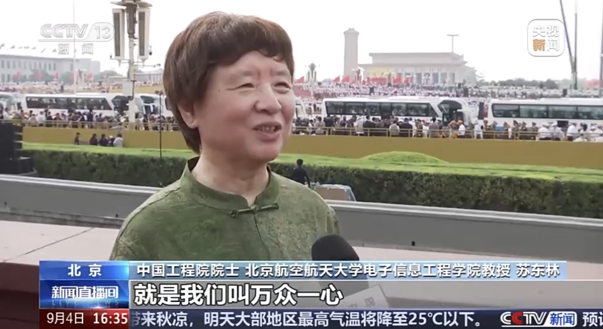 【同期】中国工程院院士 北京航空航天大学电子信息工程学院教授 苏东林:当我们全体起立唱国歌的时候,是万众一心。我特别想对那些牺牲的先烈们说,他们的血没有白流,他们想实现的愿望我们后来人替他们看到了,而且我们要一起守好他们期望建设的江山。看刚才从天安门广场走过的装备,我一直在拍。国家的强大一定要靠科技,而真正的科技力量一定要是原始创新。面向未来,越往前走,关键技术的难度、原创性就越难。我们必须奋发图强,像我们的先辈一样,咬紧牙关去突破。
