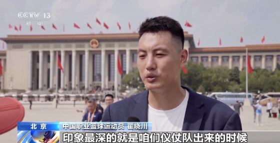 中国职业篮球运动员 翟晓川:印象最深的就是咱们仪仗队出来的时候,整齐划一、威严,非常震撼。作为一名运动员,我们应该更加努力训练,打出好成绩,回馈祖国的培养。