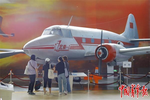 游客在北京航空航天博物馆里参观“北京一号”客机。中青报·中青网见习记者 黄晓颖/摄