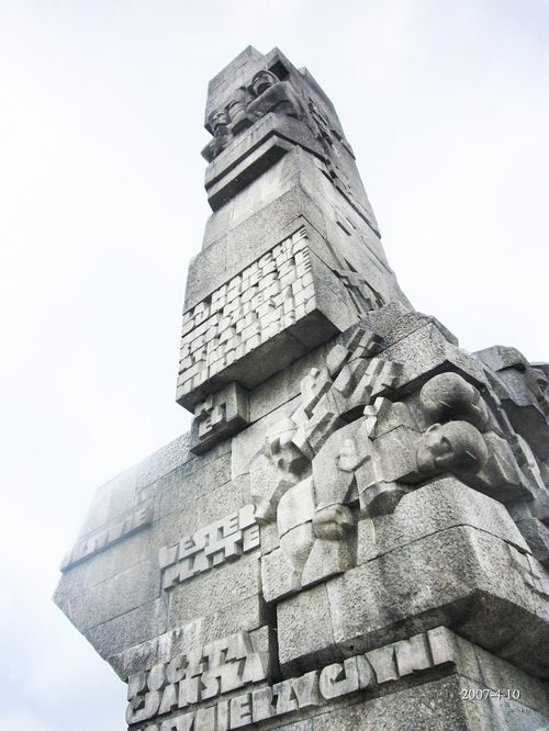 我们到了纪念碑,它在山包上,25米高的纪念碑很突出。它是被好几层台阶逐渐提升起来。从平地上看上去,远远高于25米。我们在小山包绕一圈,雨大起来了。再上去,绕一圈,纪念碑上有图案有文字;再上去,绕一圈,发现纪念碑上面还有坦克的雕刻;再上去,只有我一个人了。终于看清楚纪念碑的庐山真面目了。雨哗啦啦地下起来了,要照相就困难。一会儿,衣服就滴水,害怕相机湿了,好艰难我与纪念碑合影了。怎么形容纪念碑呢?我觉得,它像一把断刀,刀把子的地方是坦克压在两名战士身上,往上有几个大字和几十个小字谓:波兰士兵作战处纪念、在二战中的第一处、格旦斯克邮局、格丁尼亚保卫战。最上面是两个荷枪实弹的战士。一个纪念碑囊括这么多内容,真不简单。