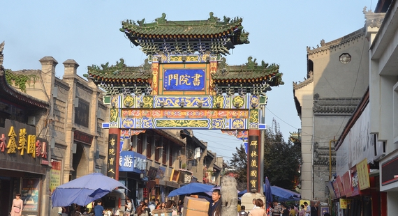 走过书院门的东面,辗转来到它的正门前,高大宏伟,古味十足的牌楼耸立在古街的门首,牌楼上端“书院门”三个金色颜体大字,分外抢眼;牌楼两旁“碑林藏国宝”、“书院育人杰”的对联,鲜明地诠释了这两座古建的意蕴。在此我从资料得知,“书院门”之所以叫这个名字,是源于此街中有个关中书院,它是明、清两代陕西的最高学府,为全国四大学府之一。伴随着几百年历史凤云的变幻,书院门一路走来,如今它已成为古都西安的书画荟萃之地,一条色彩浓郁的古文化街。向街里走去,只见这里店铺、摊位鳞次栉比,比之前更多、更密,有的还把商摊挤挤挨挨地一溜摆在街道的中间,街面显得更加窄逼。大大小小的铺面挂满了专制的湖笔,摞满了各种宣纸,摆满了精制的墨砚,各样古玩、工艺小品、旅游用品比比皆是。我随意走进几间画室,只见在满眼书画的围拢中,有的店主在热情地招揽顾客、介绍书画作品,有的还在潜心作画或专心挥洒书法,让人感到这里既有商业文化的氛围,又有书香之堂的高雅之味,不愧为一条具有仿古特色的商业文化街。我想,这也正是它吸引众多中外游客和文人雅士的魅力之所在吧。