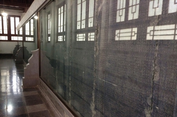 走近碑亭,见其下矗立着碑林最大的石碑《石台孝经》,这座碑亭也就是为陈列它而专门修建的。这块石碑刻于公元745年,是唐玄宗李隆基亲自书写的。前面是他为孝经作的序,后面则是孝经的原文。李隆基如此推崇孝经,大概是要推行他以“孝”治天下的理念吧!此碑由四块石头组成,底座筑有三层石台,上面刻有精细的花草、瑞兽、卷云等,由此而称“石台孝经”。此碑为隶体书法,笔力风流遒劲,秀美多姿,是唐碑隶书之典范,为国宝级文物,具有较高的历史价值和书法艺术价值。我们无暇细看,只围着石碑缓步观览了一圈,略知大概,即向各个展厅走去。首先走进第一展室,这里陈列着目前我国仅存的一套完整的石刻经书《开成石经》,其中包括《周易》、《尚书》、《诗经》、《礼记》、《春秋左氏传》、《论语》、《孝经》、《尔雅》、《孟子》等13部经书。在此展室游走,一道道长长的石碑紧密排列,庄重严谨;每方石碑上两面石刻的文字洋洋洒洒、密密麻麻,看得人眼花缭乱。在这里,我觉得好像进入知识的迷宫,旷远无涯、高深莫测。面对这浩如烟海的石书之林,想到过往的岁月,自己还曾给学生讲述过诗经、论语,或春秋、左传之类,就有些汗颜,自己那一点点浅薄的知识,在这里显得是多么的苍白和无知啊,如果那时能到这儿多走几回,也许自己的底气就会稍稍足一些。