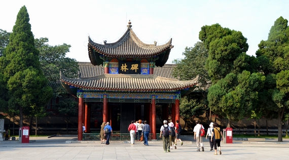 游完西安城墙,从城墙南面魁星楼下来,迎面就看到碑林博物馆高大的门楼,厚实的灰砖墙,方正的三道朱红大门,致密的灰瓦飞檐,让这座仿古大门显得厚重而富丽,而屋脊两侧和翘翘的檐角上依次排列的瑞兽,则为它添加了灵动和祥瑞,极富艺术的魅力。今天,在黑底金字的“西安碑林博物馆”的门额下,还挂了一条“热烈欢迎全国劳模莅临参观指导”的横幅,即刻,让人感到这座古建多了一份尊贵的荣耀。