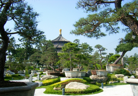 随后,我们惬意地去观赏这里有名的盆景园。盆景是我国特有的传统艺术,它起源于唐代,深受皇家的青睐,随后逐渐走向民间,在不断的发展与创新中,成为园林艺术的珍品。它通过塑造不同的景观形象,把自然景物与人文艺术,巧妙地融为一体,有极高的观赏价值和艺术价值。我想这个“中国唐苑”之名,大概就是为弘扬盆景这一祖国珍贵的传统艺术,彰显盆景文化的内涵,传播盆景知识而起的吧。盆景是“中国唐苑”里的镇园之宝,其种类繁多,形态各异,风格有别,意趣不同,近年来远近闻名,享誉国内外。这里不同的展馆,大大小小的盆景多不胜数,走来绕去,半日之时,只能匆匆掠过。以松树盆景为例,就会让人看得眼花缭乱。那些栽培在不同花盆里的松树,千姿百态,美不胜收。有的造型优美、清幽俊秀,有的兀立挺拔、勃勃向上,有的古雅沧桑、枝叶纷披,有的玲珑稚嫩、充满生机。一眼望去,林林总总,蓊郁葱茏,宛如一片繁茂美丽的松树林。在此我突然想到,曾到安徽歙县参观过一座盆景园,那里众多美观的盆景,堪称园林一绝,其中一盆名为“南国风情”的古榕,历经百年风霜,今日仍枝繁叶茂,郁郁葱葱,曾获昆明世博会金奖。那园林景观,和今日所见“中国唐苑”盆景园的景象,真有异曲同工之妙,不过“唐苑”的更壮阔一些。不知此“唐苑”里可有更骄人的盆景?于是我们就向园内的“精品盆景园”走去,不巧,那天展馆未开放,但透过门外围栏,可见古典式展厅外的庭院内,摆放着不少造型别致,树姿漂亮的盆景景观,再配以各种不同的石像、奇石造型,真是相得益彰,养人眼目。如若能开门进去,我想里面定会有让人惊艳的佳作美景的。无奈当日无缘观赏,只好任思绪驰骋去了。