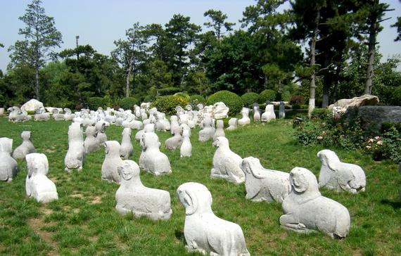 之后,老傅作导游,带我又去游览了几处景点。沿湖缓行,见水中锦鲤戏游,有如杭州西湖花港观鱼的情景;看湖上曲桥道道,游人迤逦前行;望对面松林葱郁,松枝伸出长长的手臂,好像在欢迎各方的游客。我们信步走在磨盘铺就的小道上,细观路边、草地遍布的奇石、怪石,其中一处草坪上,见有一盘巨大的白色卧石,上面纹路层叠参差,纵横交错,不知其意。后看说明,方知这是一块有故事的巨石,叫“盘龙驾云”石。相传这块巨石是汉武帝的象征,“陷囹圄,落民间,尝疾苦,意外龙椅上,方在大汉之中兴”说的就是这段典故。这时再细看这块石头,果真上面像是有巨龙盘旋,下面云雾翻卷,尽显天子之象。这段故事,赋予这块巨石以生命,一下子让它活灵活现起来,让游人在观赏之时,唤起心中的浮想,增添游兴和古趣,不能不说是造园者的匠心之作。一路观景,不觉走近“百羊开泰”景点,眼前,一群白色的石羊,俯卧在一大块绿地上,每只羊的面目、姿态虽有不同,但都给人以温顺、憨厚之感。徜徉其中,轻抚这些可爱的生灵,心中顿生绵柔、温和之情。由此想到古时“三羊开泰”之说,它是一种吉祥美好的寓意,表示大地回春、万物更新,来年一切顺畅之意。当然“百羊开泰”的寓意就更加丰厚和深远了。在此不由想到,每逢农历的羊年,“羊”的吉祥物,处处可见,“三羊开泰”的宣扬,更是铺天盖地。平日不少物品、食品都以“三羊开泰”命名,记得我家的一尊花瓶,买时也是叫“三羊开泰”??杉?ldquo;羊”自古以来,就是人们喜爱的一种动物,它温顺、柔和的性格,也正应了人们对平和、善良的追求。因之在这个公园里“放牧”一群可爱的石羊,也不失为一个吸睛的创意。