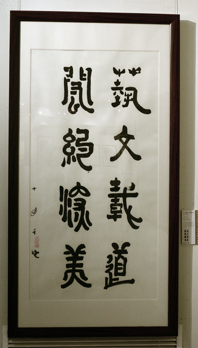 在展览的一开始,我们就欣赏到了著名艺术家、清华大学美术学院学术委员会原主席刘巨德教授为展览题写的主题书法作品——艺文载道 闳约深美。这八个字是本次展览的主题,简练而不简单地概括出了一个在理工科背景的大学中,坚持了十年举办各种艺术展览而得到的收获和感悟。有人认为,艺术不过是业余玩玩,没有什么用。有人认为,艺术太缥缈,离我们普通人太远。其实不然,只要你能从一件艺术作品中,感受到美好,那就足够。再将这种发现的眼光带到生活之中,发现生活之美,那就达到了一种生活境界。日常生活中,有时候人们常常因为追求物质的工作而疲惫不堪,然后对很多事物丧失了兴趣, 变得不容易处理很多事情,而保持对艺术的追求,会使得人生积淀很多智慧,通过讨论艺术,欣赏艺术,是可以活跃我们的思想,从而使得人生丰富多彩起来。