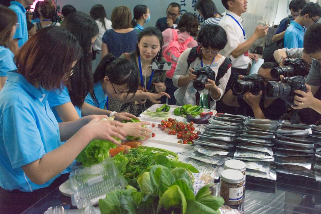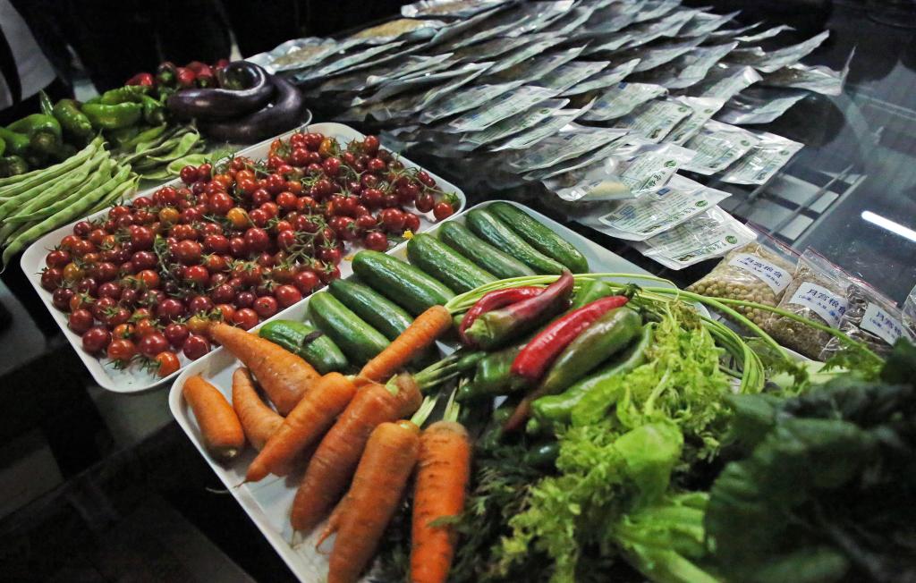 志愿者带出的“月宫”特产(新鲜蔬菜)及舱内食物样本