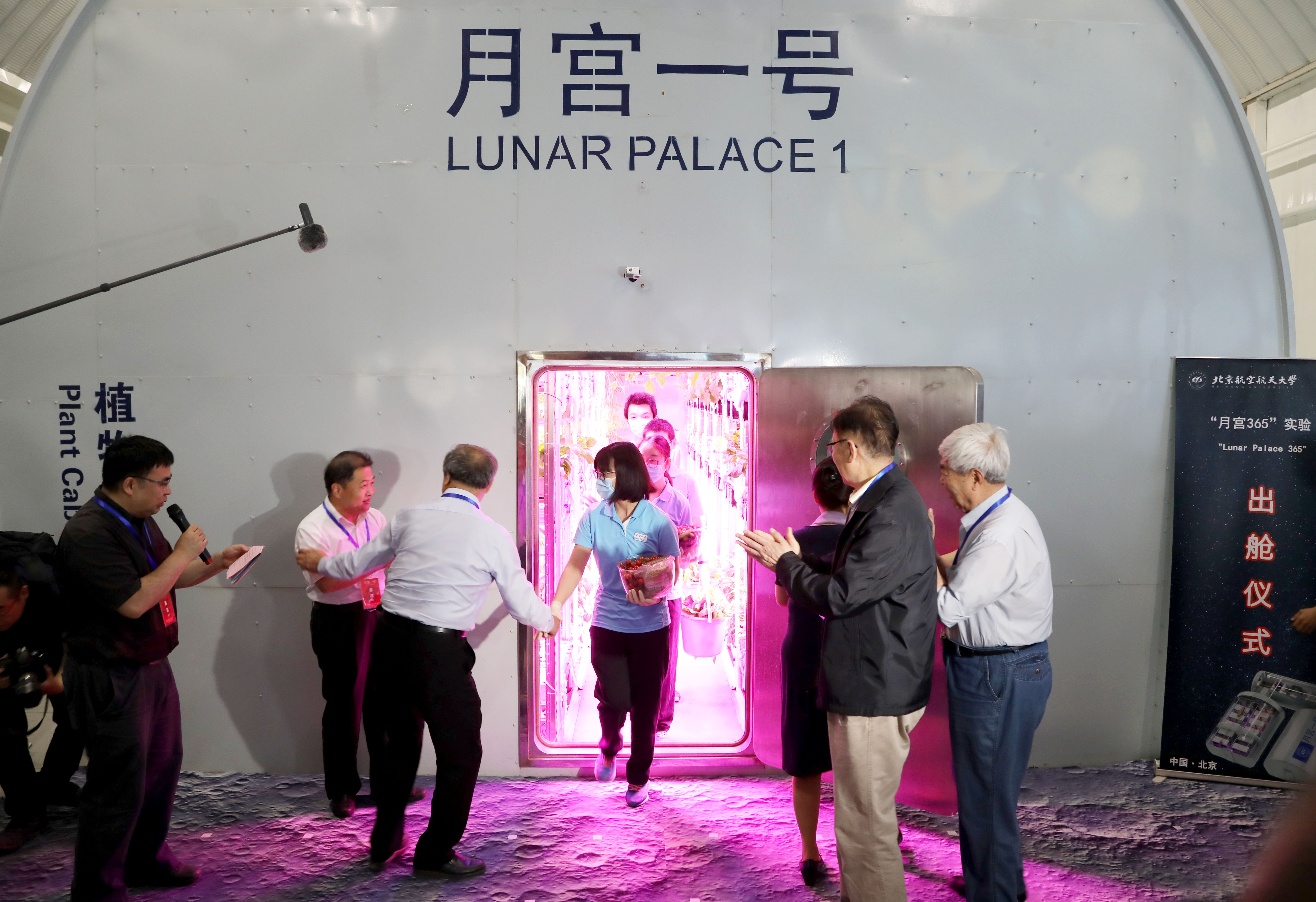 9点08分,备受关注的“月宫一号”再次缓缓开启舱门,刘慧(舰长)、刘佃磊、胡静斐、高寒4位志愿者微笑着走出“月宫”,月宫一号”内进行的为期365+5天的、世界上时间最长的“月宫365”实验获得圆满成功。