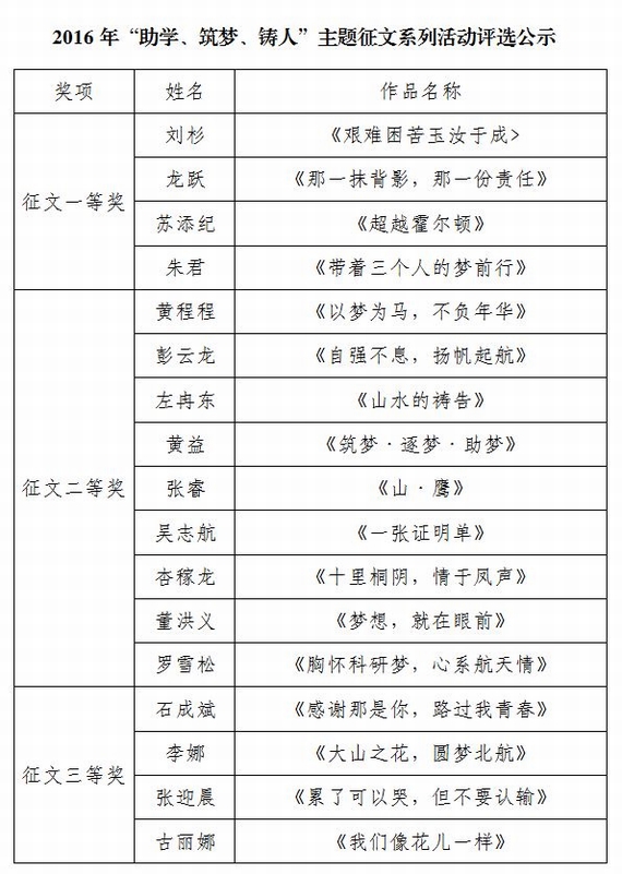 为展现新一代大学生青春奋斗风采,加强对学生励志感恩教育,激励受助学生奋发自强、感恩奉献,学生资助管理服务中心近日举办2016年“助学·筑梦·铸人”主题征文系列活动。自活动开展以来,经学生申请、学院推荐,共收到了来自21个学院的82件作品。通过学院资助负责人初评、学生资助管理服务中心复评,本次征文活动共有34件学生作品脱颖而出。现将获奖作品及作者名单公示如下: