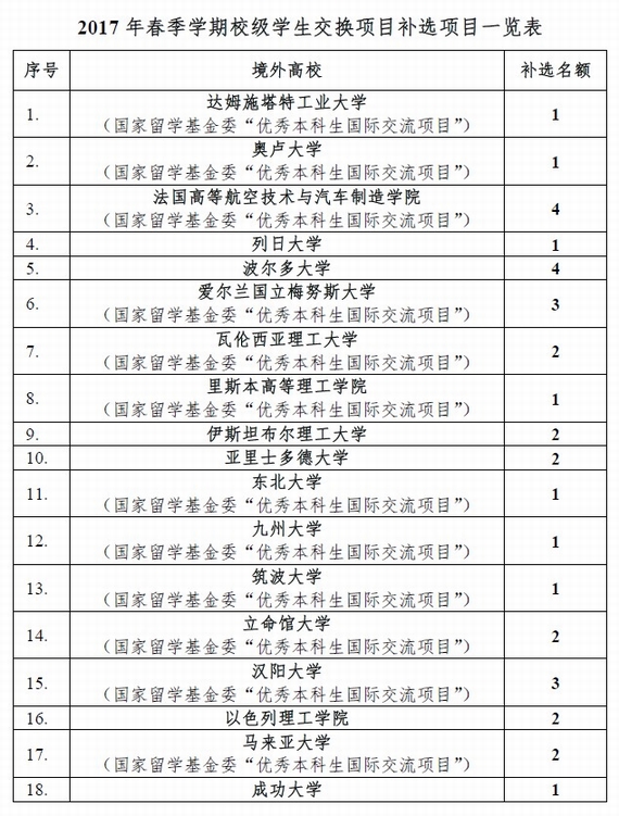 本着“公平、公正、公开”的原则,根据《北京航空航天大学学生交换项目管理办法》,经“个人申请、学院推荐、学校评审”的程序进行公开选拔、综合考核、择优录取,2017年春季学期学生交换项目选拔录取工作正在进行,部分项目仍有名额可供同学申报,补选项目及选派人数如下: